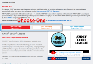 For FIRST LEGO League Challenge, select FIRST LEGO League, 1)Select Division, and 2) FLL Challenge Team Registration.